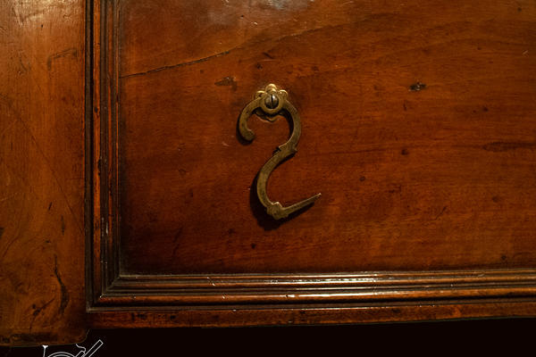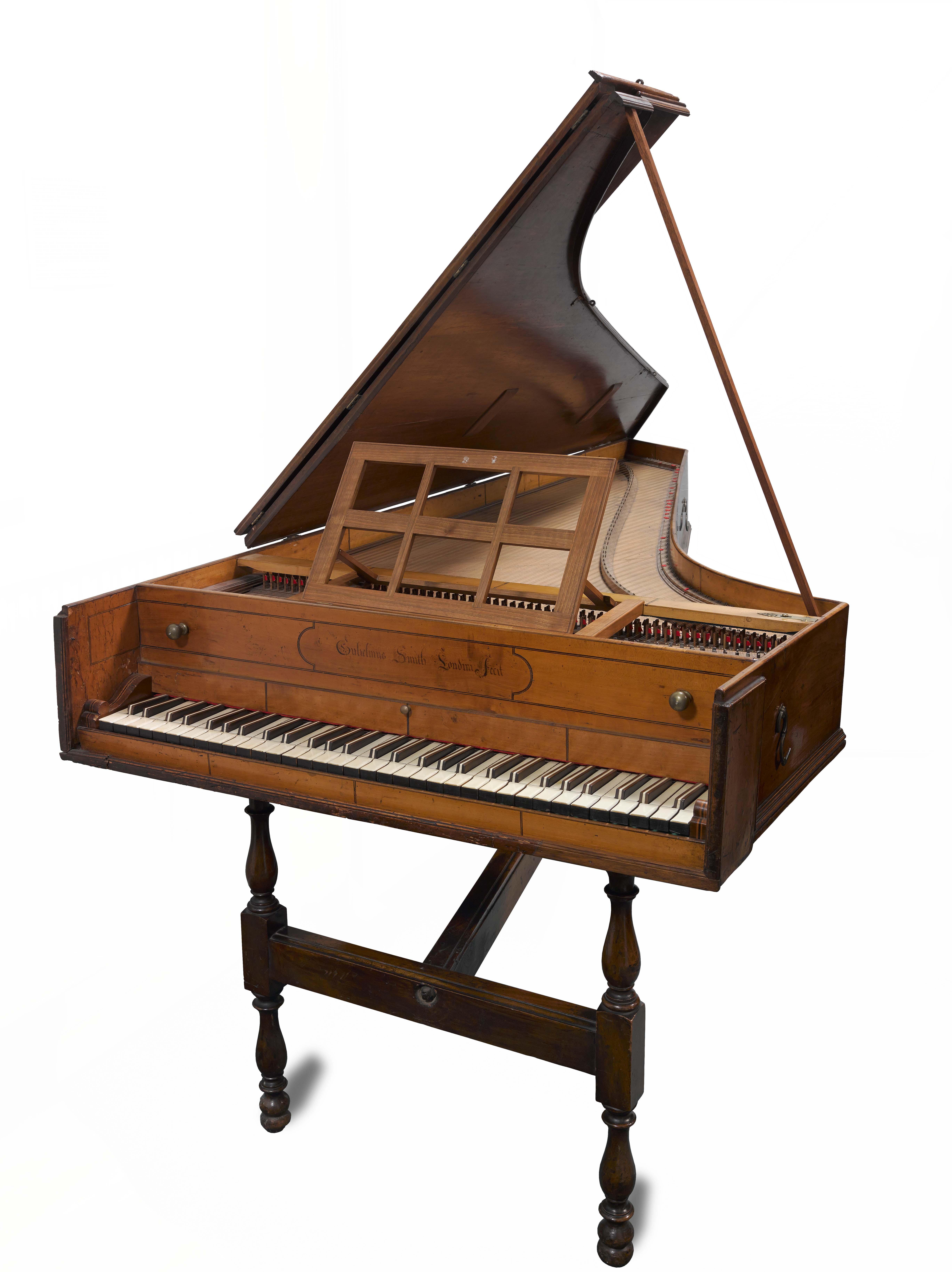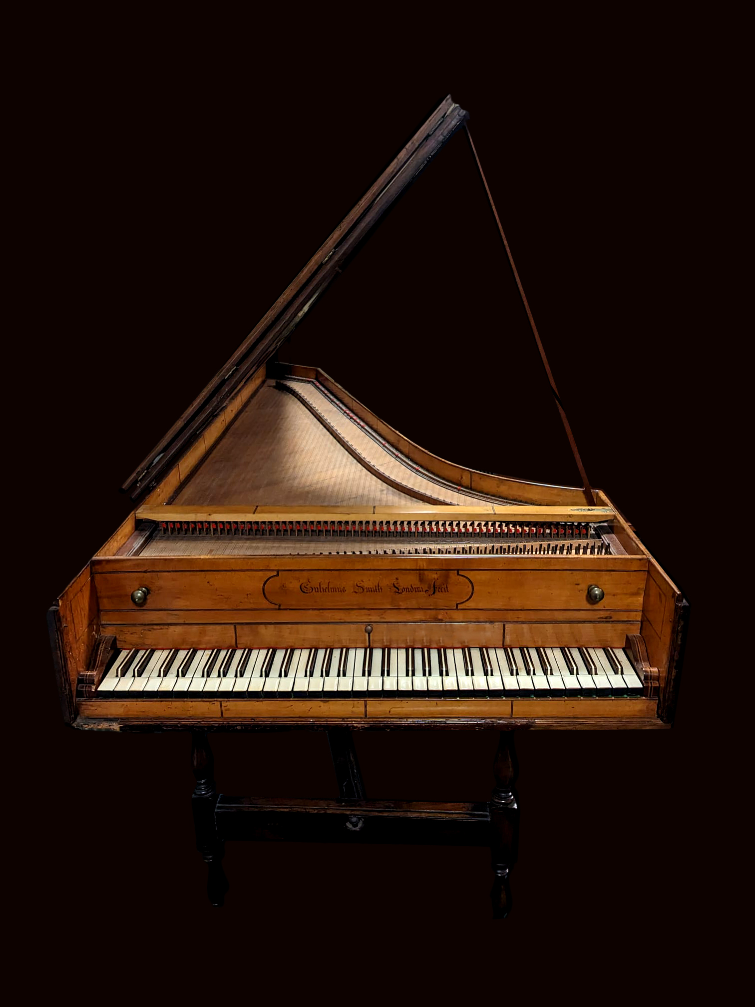 Little is known of William Smith save that he was apprenticed to Benjamin Slade in 1709, probably in succession to Thomas Hitchcock. Like Tisseran it shows the connexion with spinets in its diagonally set soundboard. An affinity with Hitchcock is shown by the skunktail sharps, a graphic term to describe keys which are striped like the tail of a skunk with a longitudinal sandwich of ebony-ivory-ebony. However, the tail of the case is the normal English shape, not the rather Germanic curve which Hitchcock employed on his only surviving harpsichord.